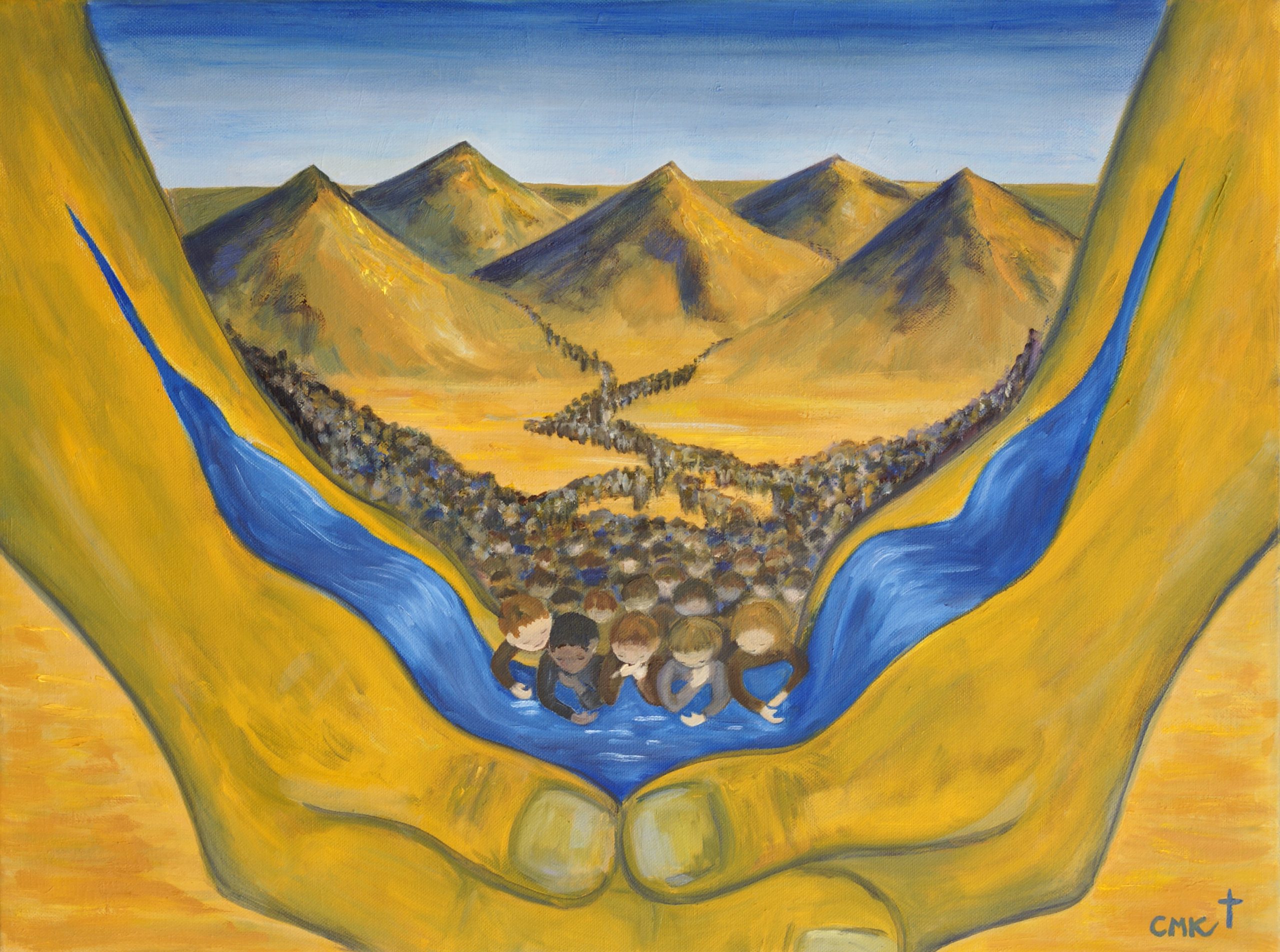 This painting portrays the hands of God, cupped and waiting for us to come out of the spiritual desert of dryness, to come to Him and accept the refreshing water of eternal life which God is waiting to give us when we ask Him.